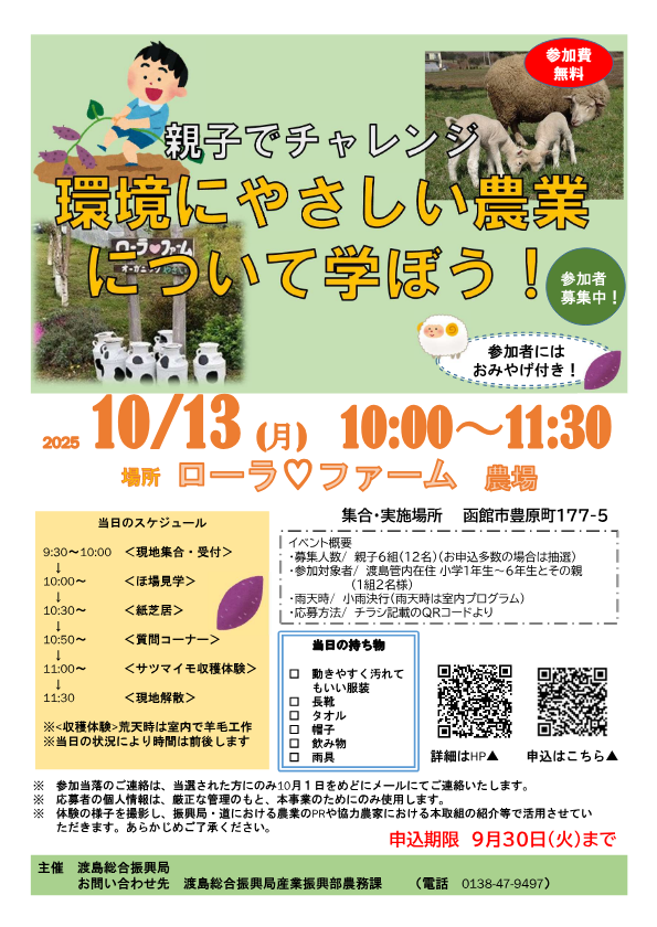 渡島総合振興局では、環境にやさしい農業について学んでいただくことを目的に、実践農場の見学や収穫作業等を体験するイベントを開催します!