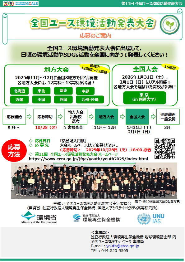【募集】「第11回 全国ユース環境活動発表大会」参加高校の募集について(締切 10/28)