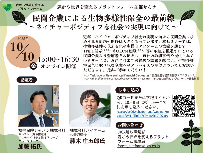 本セミナーでは、生物多様性の見える化や多様なアクターとの協働を通じてTNFD開示やOECM登録等の取組を推進されている民間企業より登壇者をお招きし、自社の取組事例や提供されているサービス、及びこれまでの経験や課題を踏まえ、生物多様性保全に取り組む企業へのアドバイスや展望についてもお話しいただきます。