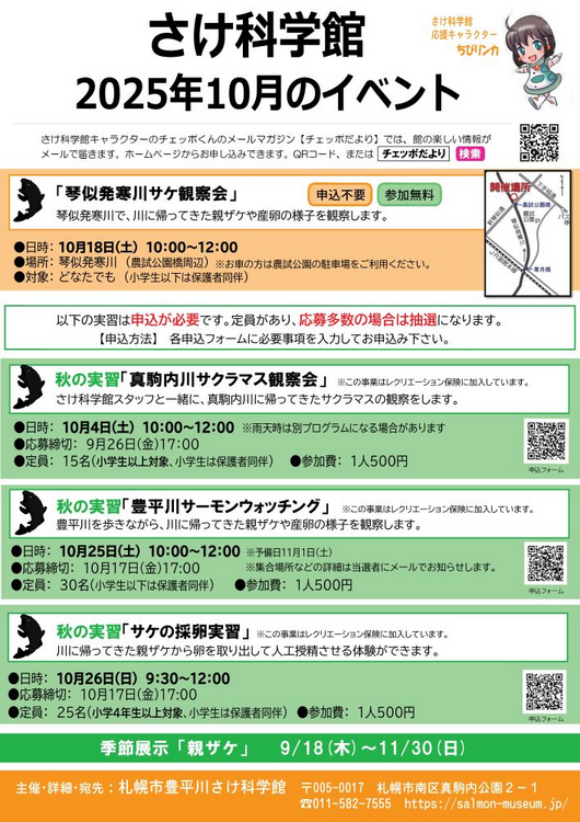 [問い合わせ先] 札幌市豊平川さけ科学館 TEL:011-582-7555