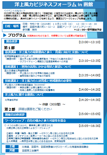 2025年7月に再エネ海域利用法に基づく「促進区域」に指定された松前沖・檜山沖での洋上風力発電の展開を見据えて、渡島・檜山管内の企業を中心に、道内企業が洋上風力産業に必要な資格・設備等の情報を把握し、具体的な参入イメージを持てるよう、講演及びワークショップを開催します。