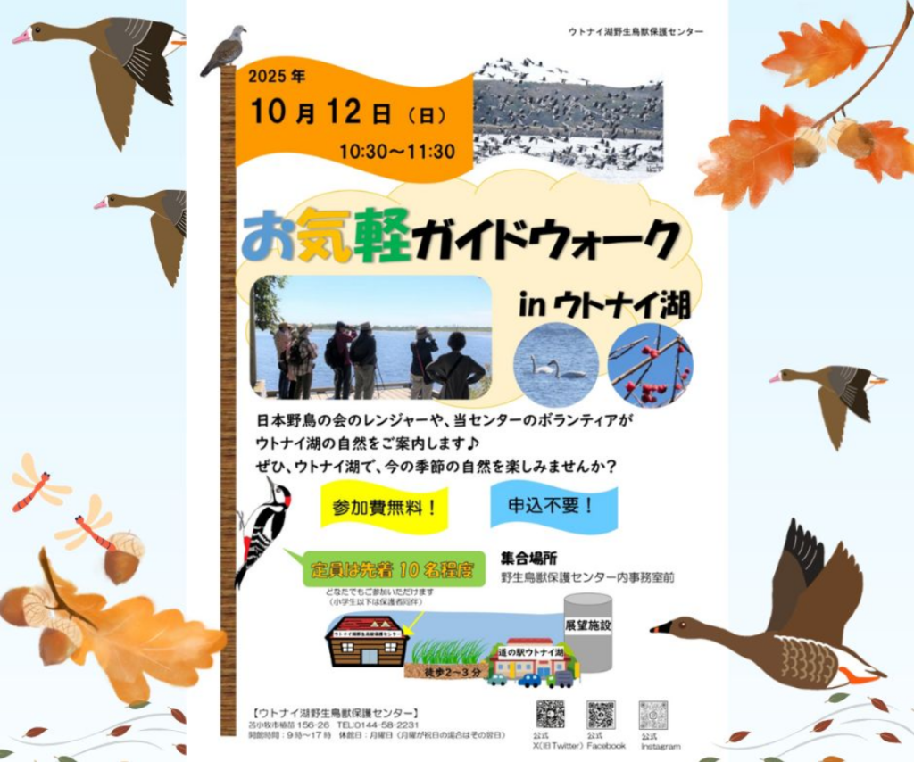 [内容] レンジャーや当センターのボランティアが40分程度、屋外でウトナイ湖の自然を案内するガイドウォーク。