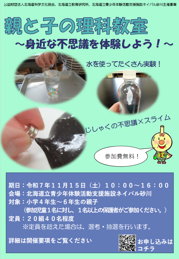 [主催] (公財)北海道科学文化協会、北海道立教育研究所、北海道立青少年体験活動支援施設 ネイパル砂川