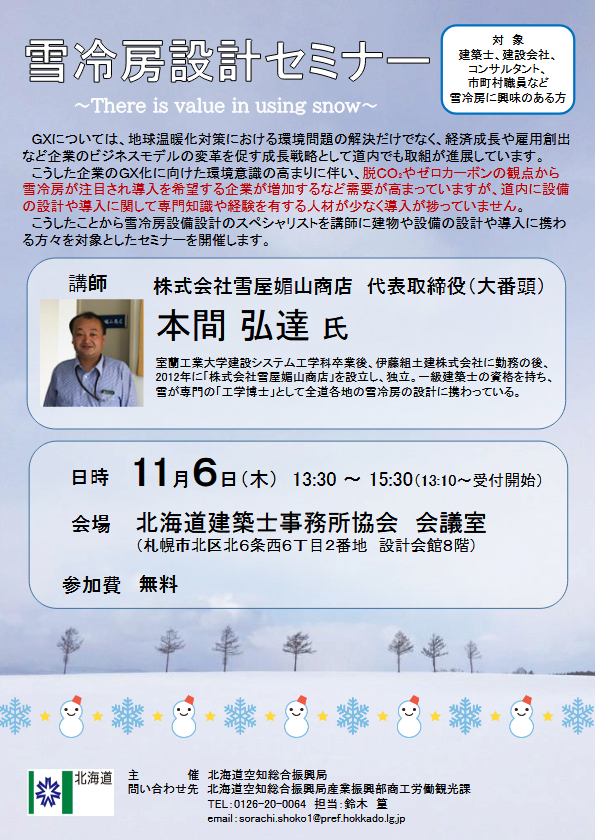 こうしたことから雪冷房設備設計のスペシャリストを講師にお招きし、建物や設備の設計や導入に携わる方々を対象としたセミナーを開催します。