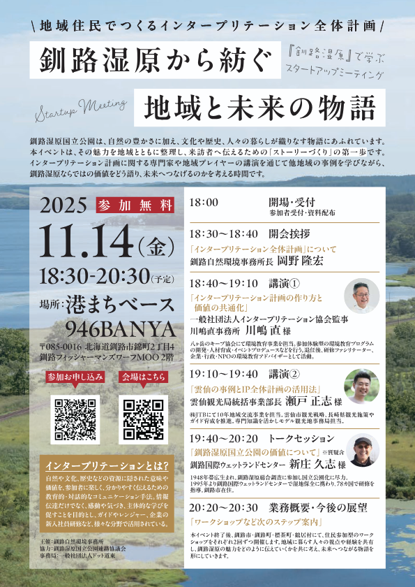 [内容] 釧路湿原国立公園の自然環境や文化、歴史、人々の暮らしなど、多様な地域資源を一体的に見つめ直し、その価値を来訪者・地域住民双方にわかりやすく伝え、活用してゆく「釧路湿原国立公園インタープリテーション全体計画」について、インタープリテーションとは何か、先進地域での取組を学び、地域の皆様と一緒に考えるスタートアップイベントです。
