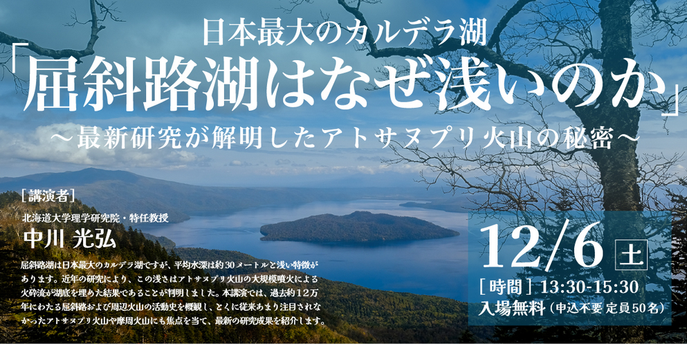 本講演では、過去約12万年にわたる屈斜路および周辺火山の活動史を概観し、特に従来あまり注目されなかった「アトサヌプリ火山」や「摩周火山」にも焦点を当て、最新の研究成果を紹介します。