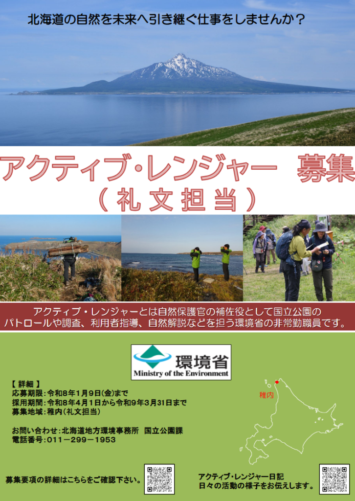 [問い合わせ先] 環境省 北海道地方環境事務所 国立公園課 アクティブ・レンジャー公募係 TEL:011-299-1953