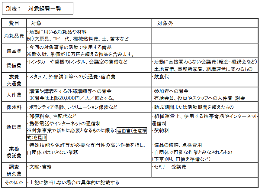 [対象経費] 助成金の使途は、申請する事業活動に伴う経費です。(「別表1」でご確認ください)