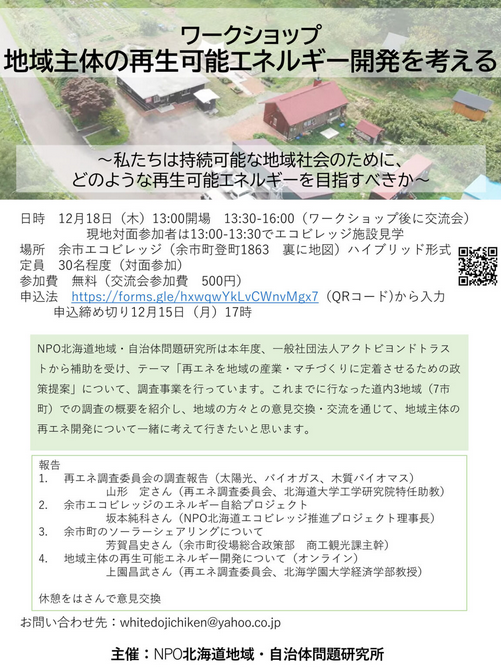 【余市・オンライン】ワークショップ「地域主体の再生可能エネルギー開発を考える」