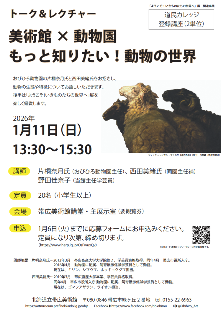 帯広美術館 で開催される「ようこそ!いきものたちの世界へ」にて、動物に関連する作品が多く展示されることにちなみ、トーク&レクチャー「美術館×動物園 もっと知りたい!動物の世界」を開催します。