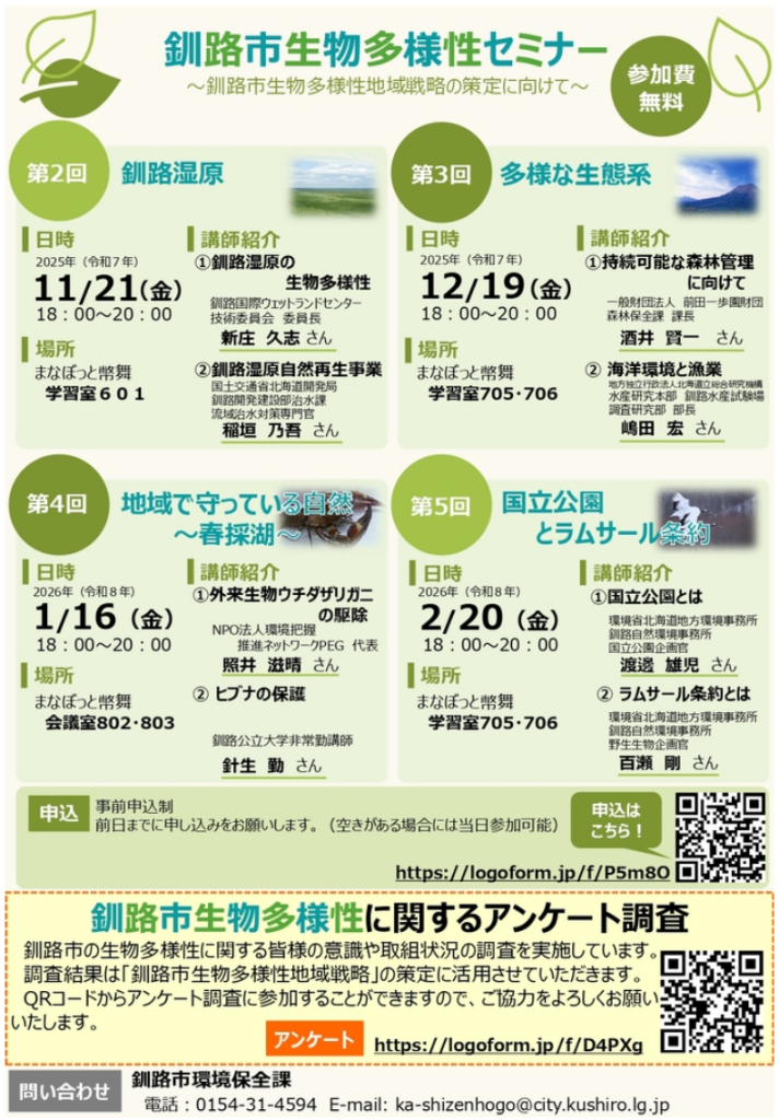 全5回で開催予定の『釧路市生物多様性セミナー』の第4回を、1/16(金)に開催いたします。