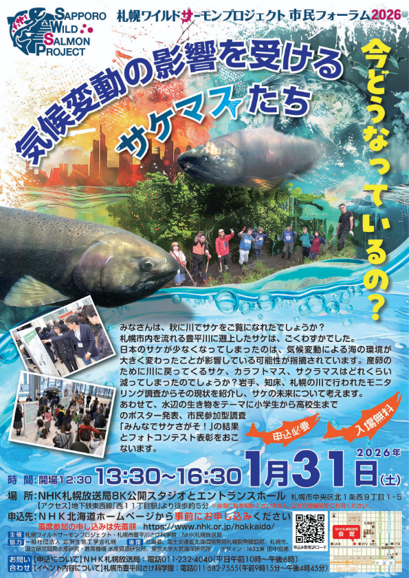 NHK札幌放送局では、豊平川生まれの野生サケを増やすことを目指して結成された 市民グループ「札幌ワイルドサーモンプロジェクト(SWSP)」、札幌市豊平川さけ科学館 と共催して、市民フォーラムを実施します。