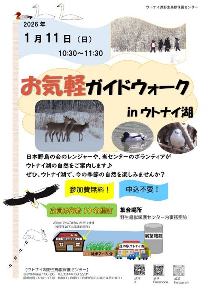 [内容] 日本野鳥の会のレンジャーや当センターのボランティアが40分程度、屋外でウトナイ湖の自然をご案内🦢