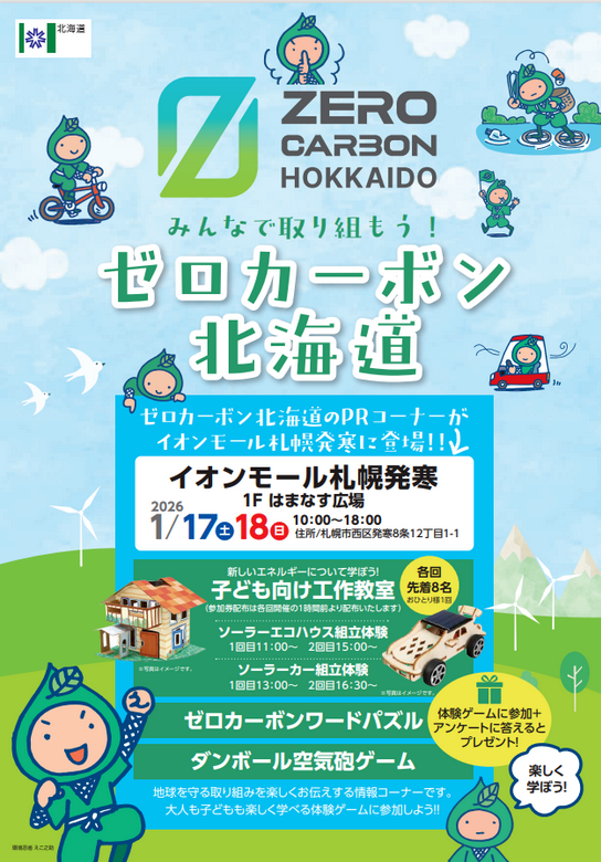 北海道庁では、ゼロカーボン北海道の実現に向けて、道民の皆さまに楽しくゼロカーボンについて 学んでいただけるよう、イオンモール札幌発寒にてゼロカーボン北海道PRイベントを開催します。