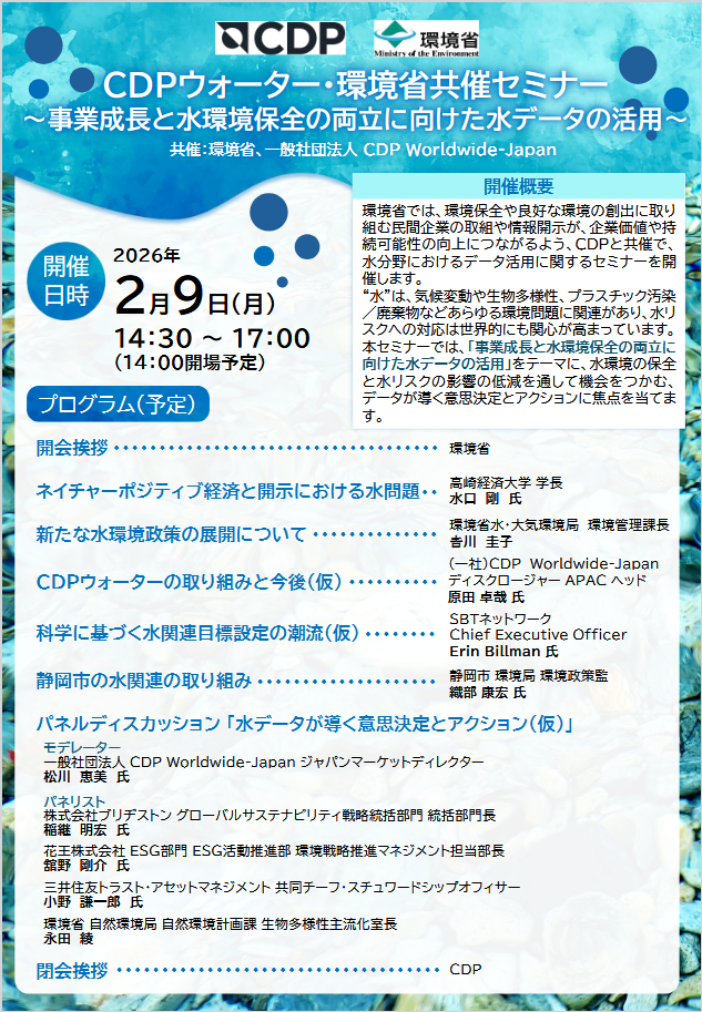 【東京・オンライン】2025年度 CDPウォーター・環境省共催セミナー ~事業成長と水環境保全の両立に向けた水データの活用~