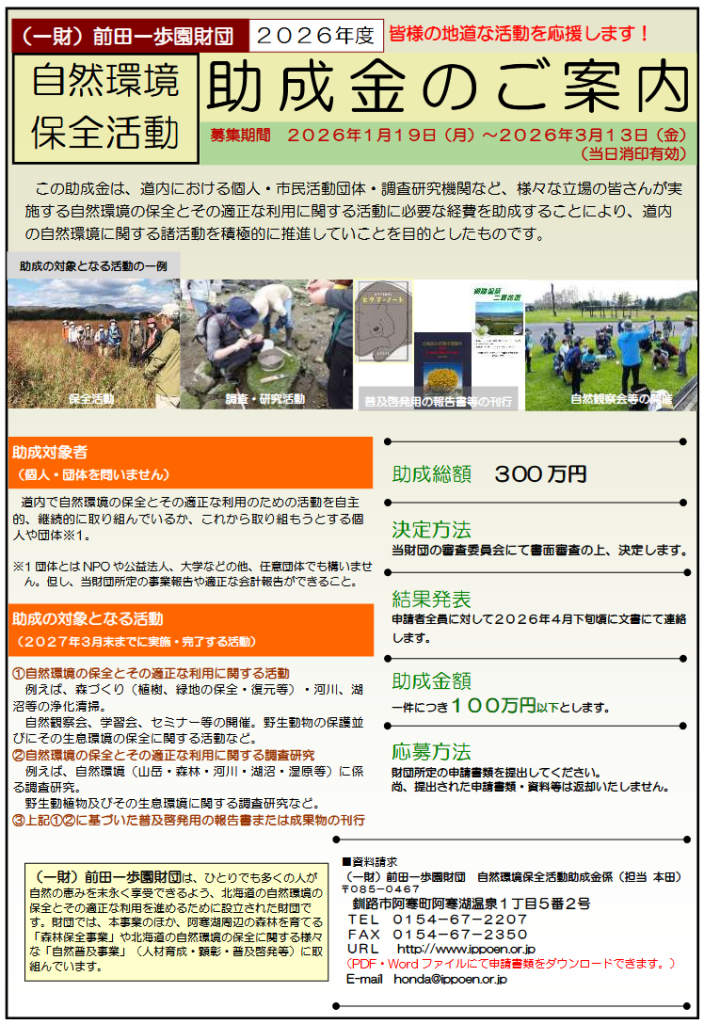 (一財)前田一歩園財団 の「自然環境保全活動助成金」は、北海道内における個人・NPO法人などの市民活動団体、また大学などの調査研究機関が実施する北海道内の自然環境の保全とその適正な利用に関する諸活動をサポートすることを目的としています。