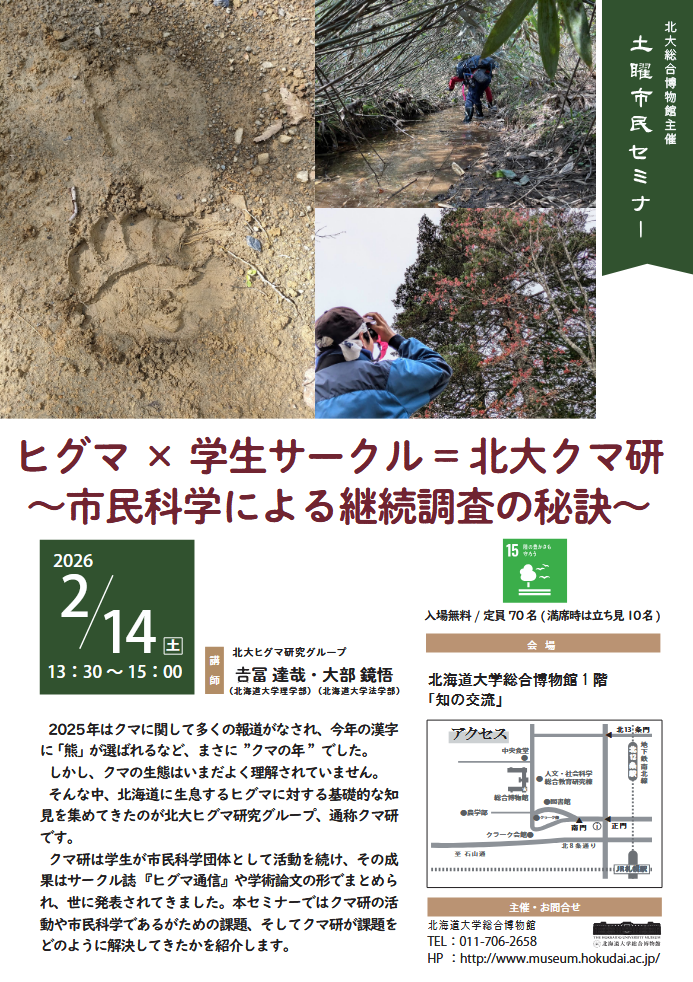 【札幌】土曜市民セミナー「ヒグマ×学生サークル=北大クマ研 ~市民科学による継続調査の秘訣~」