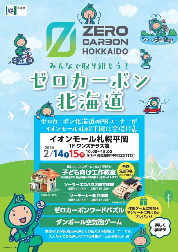 道では、ゼロカーボン北海道の実現に向けて、道民の皆様に楽しくゼロカーボンについて 学んでいただけるよう、イオンモール札幌平岡にてゼロカーボン北海道PRイベントを開催します。