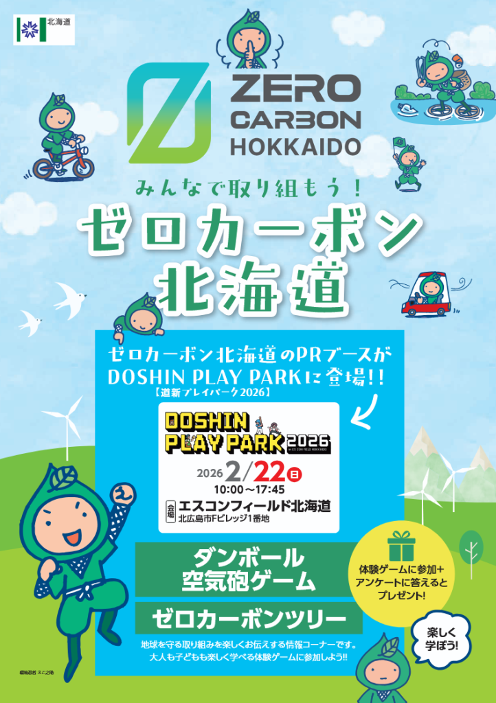 道では、ゼロカーボン北海道の実現に向けて、道民の皆さまに楽しくゼロカーボンについて学んでいただけるよう、『DOSHIN PLAY PARK 2026』にゼロカーボン北海道PRブースを出展します。