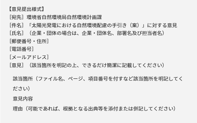※封筒の表面に『太陽光発電における自然環境配慮の手引き(案)に対する意見』と記載してください。