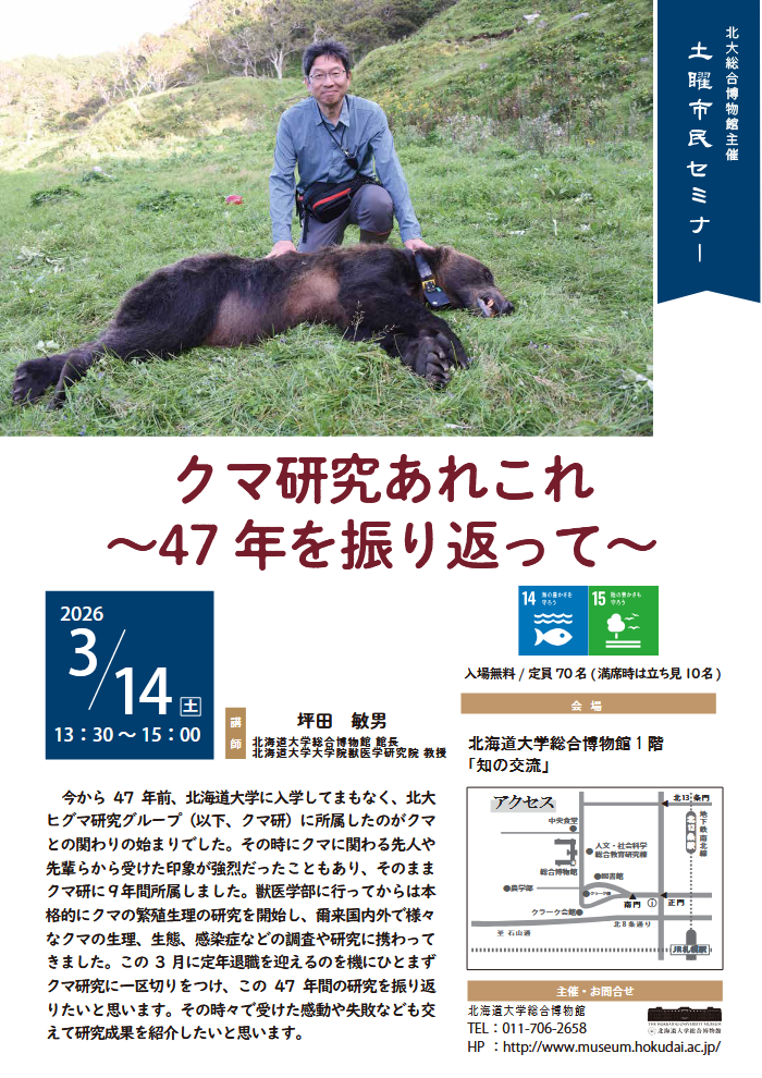 【札幌】北海道大学総合博物館 土曜市民セミナー「クマ研究あれこれ ~47年を振り返って~」