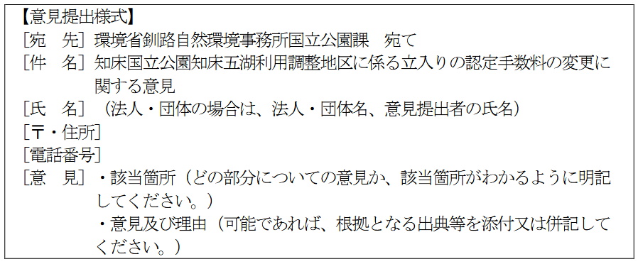 つきましては、知床国立公園知床五湖利用調整地区に係る立入りの認定手数料の変更について、国民の皆様から広くご意見を募集いたします。