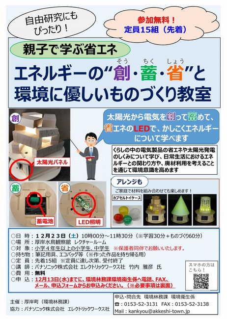 【厚岸】親子で学ぶ省エネ「エネルギーの“創・蓄・省”と環境に優しいものづくり教室」