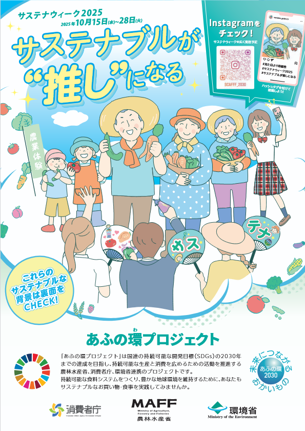 環境省は、農林水産省、消費者庁と連携し、「みどりの食料システム戦略」に基づき「あふの環(わ)2030プロジェクト ~食と農林水産業のサステナビリティを考える~」の取組の一環として『サステナウィーク2025』を実施します。