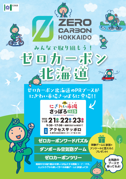 道では、ゼロカーボン北海道の実現に向けて、道民の皆様に楽しくゼロカーボンについて 学んでいただけるようにぎわい市場さっぽろ2025ゼロカーボン北海道PRブース を出展します。