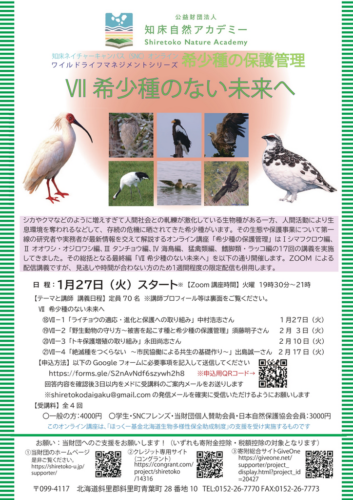 【ご案内】知床ネイチャーキャンパス(SNC)オンライン講座「希少種の保護管理」<Ⅶ:希少種のない未来へ> 1/27(火)開講!