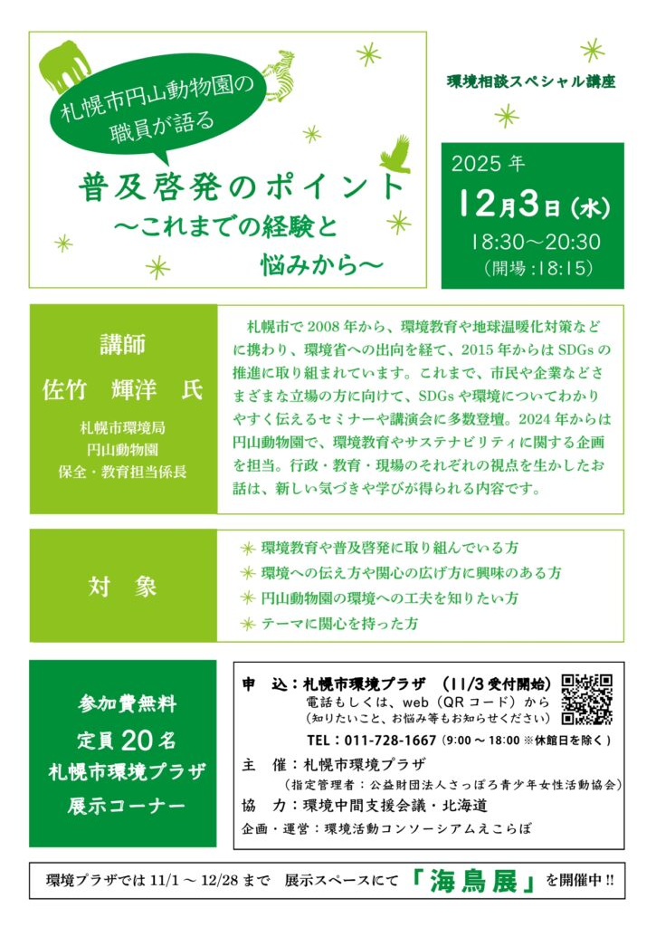 【12/3 札幌】環境相談スペシャル講座「札幌市円山動物園の職員が語る普及啓発のポイント ~これまでの経験と悩みから~」